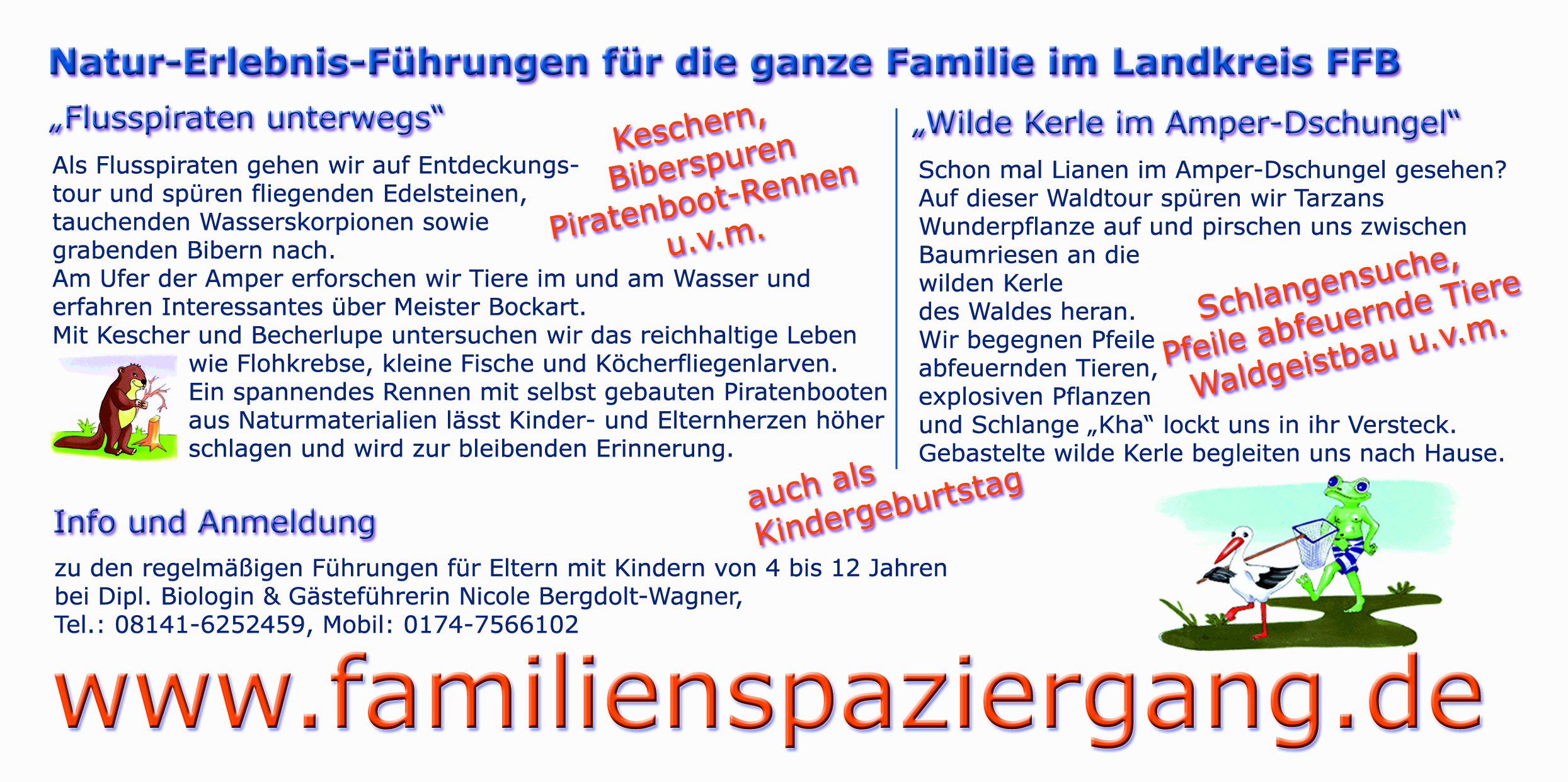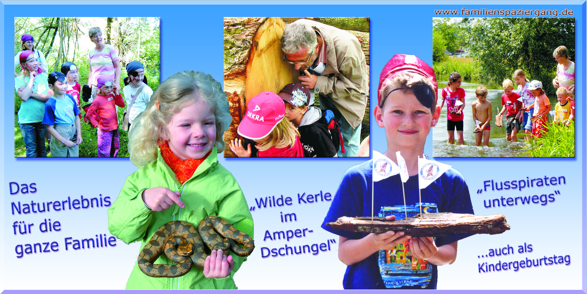 Bei Familienspaziergängen im Landkreis Fürstenfeldbruck zeige ich Ihnen wilde Kerle im Amper-Dschungel, erzähle wundersame Geschichten und veranstalte mit Ihren Kindern kleine Piratenbootrennen.